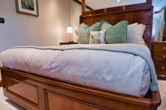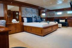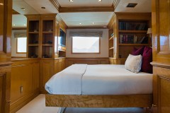 Eight guests, logical cabins. BLU sleeps 8 in 4 en suite cabins: a full-width Owner’s Suite amidships, a queen and a twin below, plus a forward main-deck queen VIP that converts into a private study when you want it quiet.