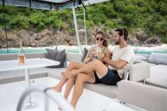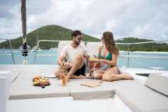 She is a 2023 sailing catamaran equipped with Starlink, so guests will be able to stay connected. She features a large, hard top Bimini, solar panels, full air conditioning, a water maker, ice maker, and full-sized fridge/freezer.
