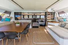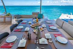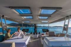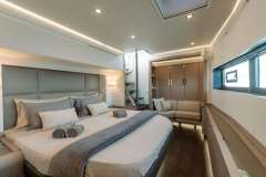 Azure is offered primarily as a sailing catamaran. The the core layout is spread out from the main saloon, which connects to the aft deck. The aft deck is where heart of the yacht is and usually it is where you, as a charter guest, spend most of your time. The tasteful cabins offer unbeatable views in the morning and are located just below deck. The cabins offer designer mattrace beds and feature ensuite bathrooms. Multiple portholes supply a sunny feeling, with the option for darkness and privacy.