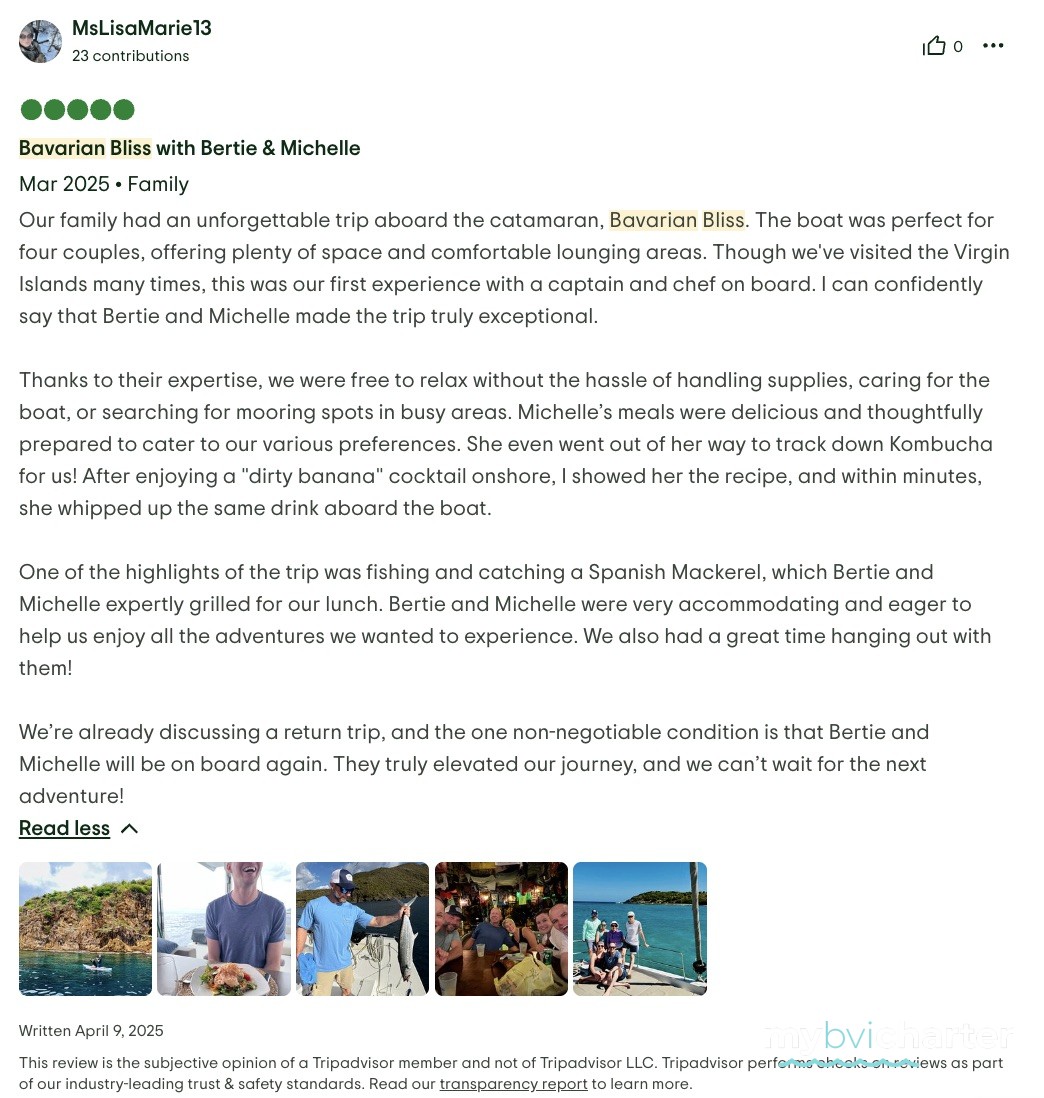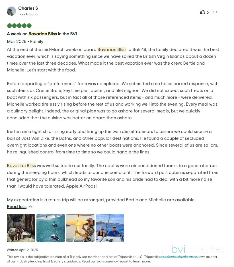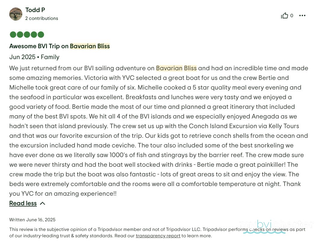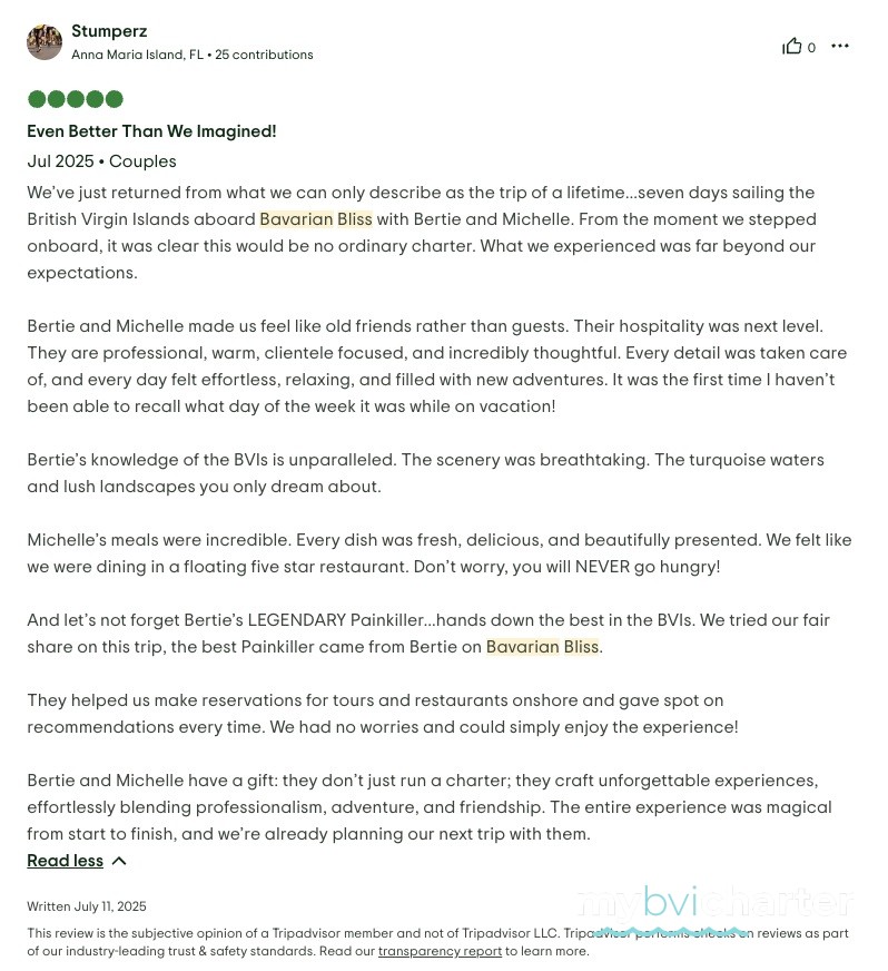 Bertie’s knowledge of the BVIs is unparalleled. The scenery was breathtaking. The turquoise waters and lush landscapes you only dream about.