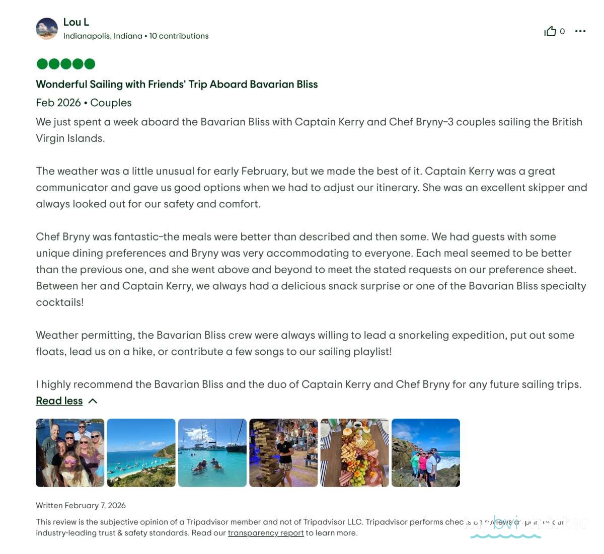 I highly recommend the Bavarian Bliss and the duo of Captain Kerry and Chef Bryny for any future sailing trips.