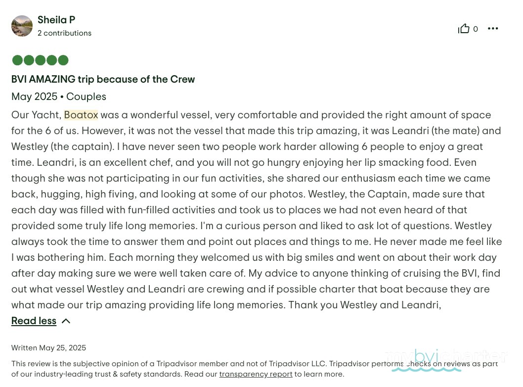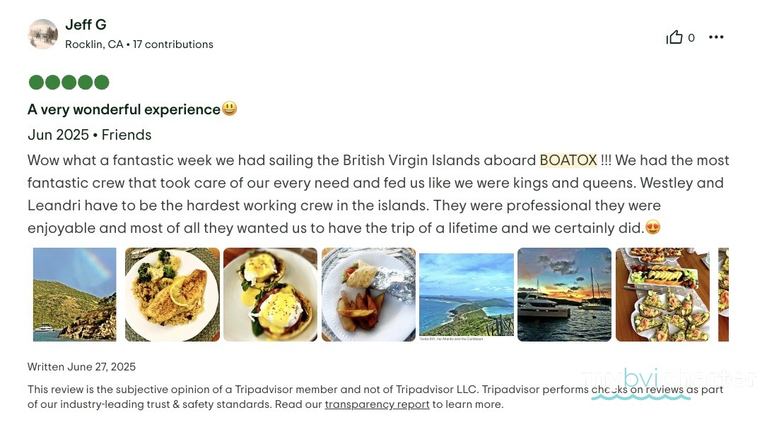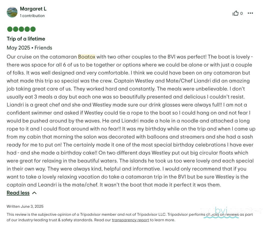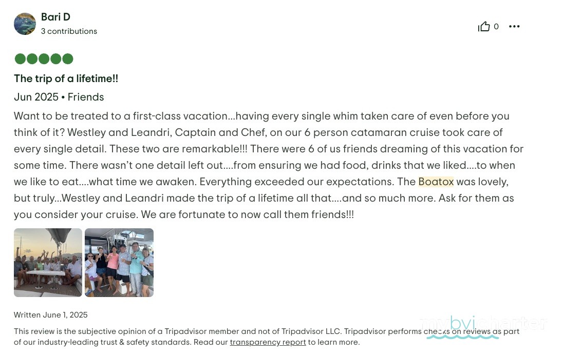 With that being said it could not have happened so seamlessly without Captain Westley and First Mate/Chef Leandri. From our first communication it was obvious they both took pride in their jobs and the boat. Boatox was very clean upon our arrival and remained that way throughout our vacation. The food and drinks were fantastic, and even tailored to individual’s likes and dislikes. We experienced amazing sailing with very high winds thanks to Westley’s expertise. He picked the perfect spot to moar each day to explore and relax. I am grateful to have met Westley & Leandri and for the pampering they gave us. None of us would change a thing.