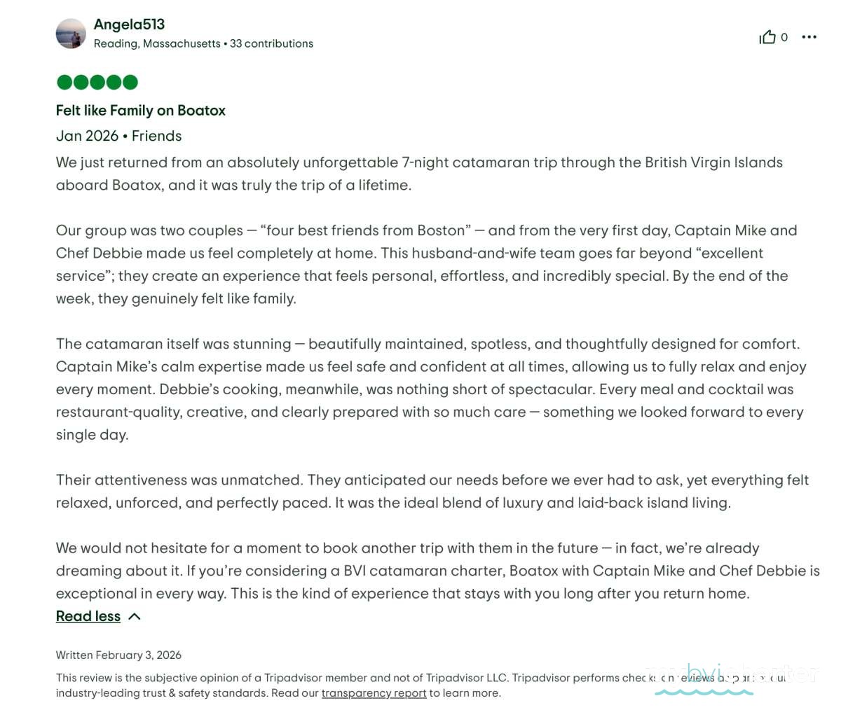 We would not hesitate for a moment to book another trip with them in the future — in fact, we’re already dreaming about it. If you’re considering a BVI catamaran charter, Boatox with Captain Mike and Chef Debbie is exceptional in every way. This is the kind of experience that stays with you long after you return home.