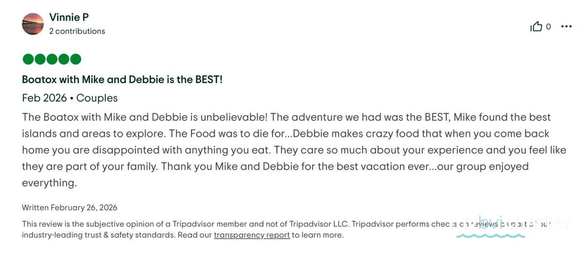 Starting with the crew - Leandri and Westley...Amazing! You can tell they have a passion for what they do and they took care of us like no other. The food was off the chart - and we ate most all of our meals on the boat. They were extremely accommodating and when we tried to help with anything and everything (which we're all wired to do!) they would not let us. One of the highlights of this trip was getting to know them and their story - just fantastic people!