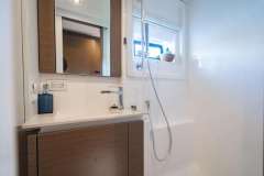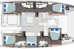 4 x queen cabins each with en-suite bath with electric toilet and stall showers.Salon has lounge area, galley, nav station, formal dining area and door opening to front cockpit as well as aft deck. Salon can be opened with beautiful natural breeze and is also fully air conditioned for guests comfort.