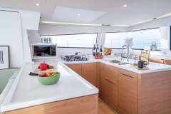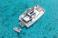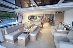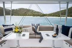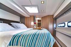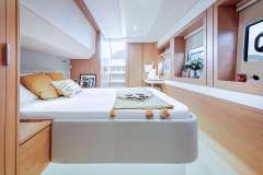 Equipped with twin Yanmar 80HP engines and state-of-the-art Raymarine navigation electronics, she’s as smooth underway as she is luxurious at anchor. The interior boasts clean modern lines, teak flooring throughout, and a welcoming saloon that blends seamlessly into the outdoors thanks to Bali’s signature hydraulic tilting aft door and wide forward-opening windows.
