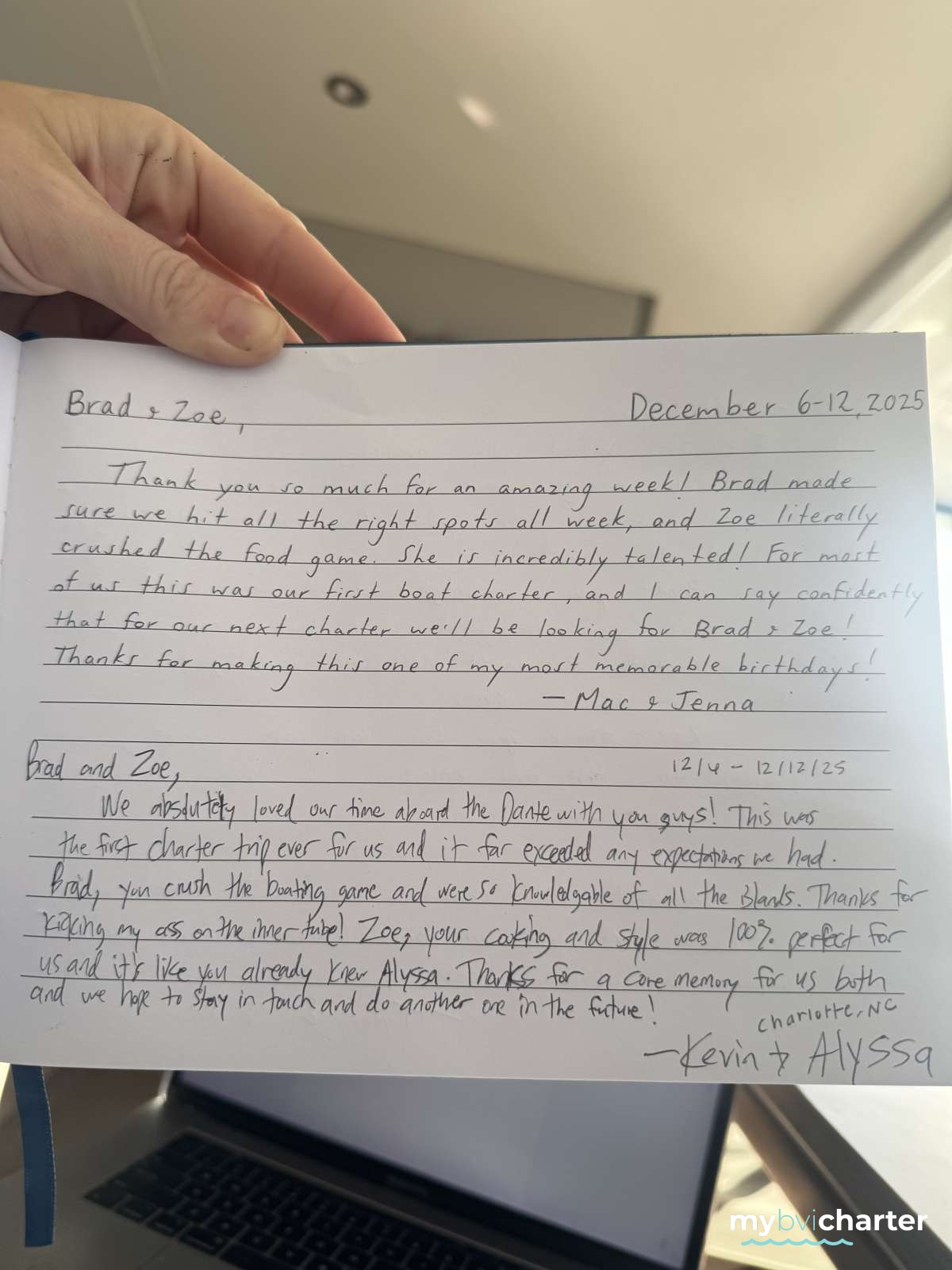 We absolutely loved our time aboard Dante with you guys! This was the first charter trip ever for us and it far exceeded any expectations we had. Brad, you crush the boating game and were so knowledgeable of all the islands. Thanks for kicking my ass on the inner tube! Zoe, your cooking and style was 100% perfect for us and it’s like you already knew Alyssa. Thanks for a core memory for us both and we hope to stay in touch and do another one in the future!