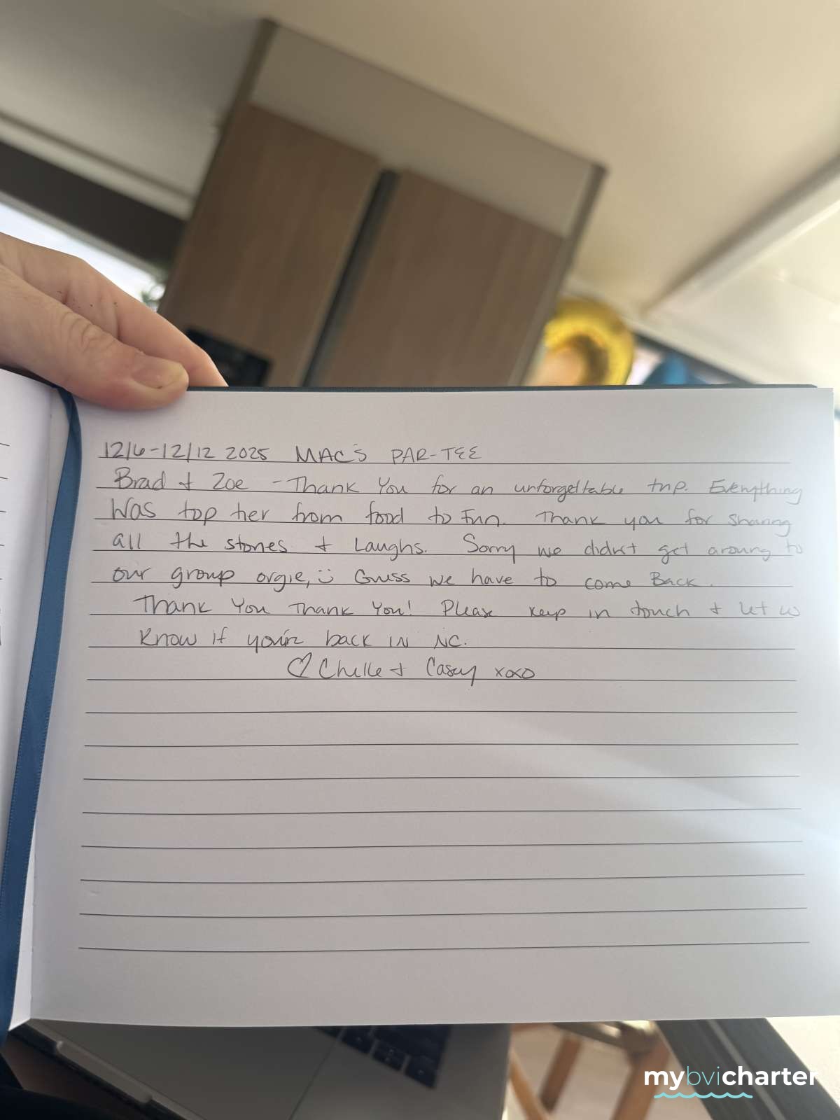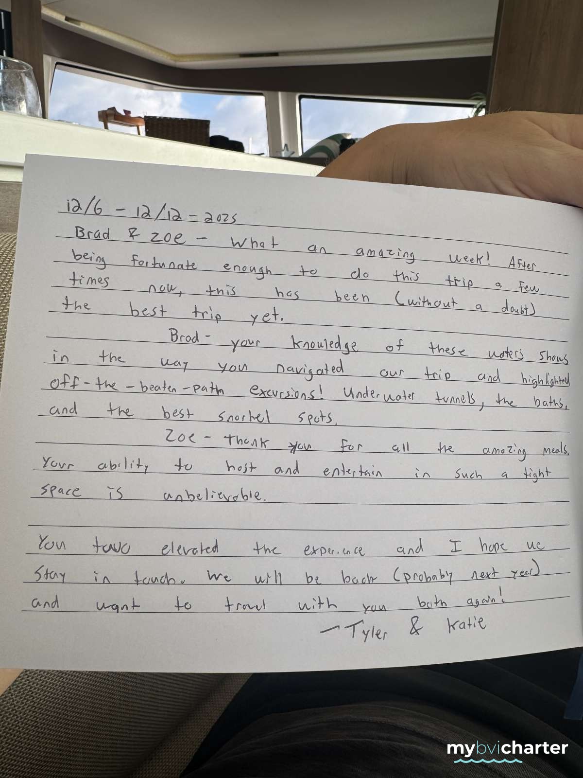 What an amazing week! After being fortunate enough to do this trip a few times now, this has been (without a doubt) the best trip yet. Brad – your knowledge of these waters show in the way you navigated our trip and highlighted off-the-beaten-path excursions! Underwater tunnels, the Baths, and the best snorkel spots. Zoe – thank you for all the amazing meals. Your ability to host and entertain in such a tight space is unbelievable.