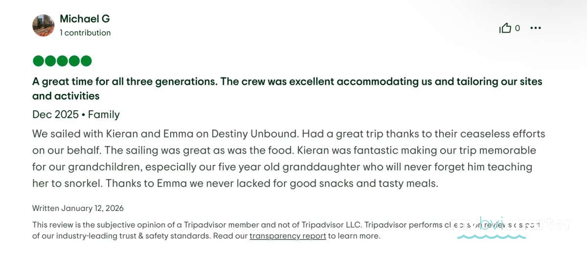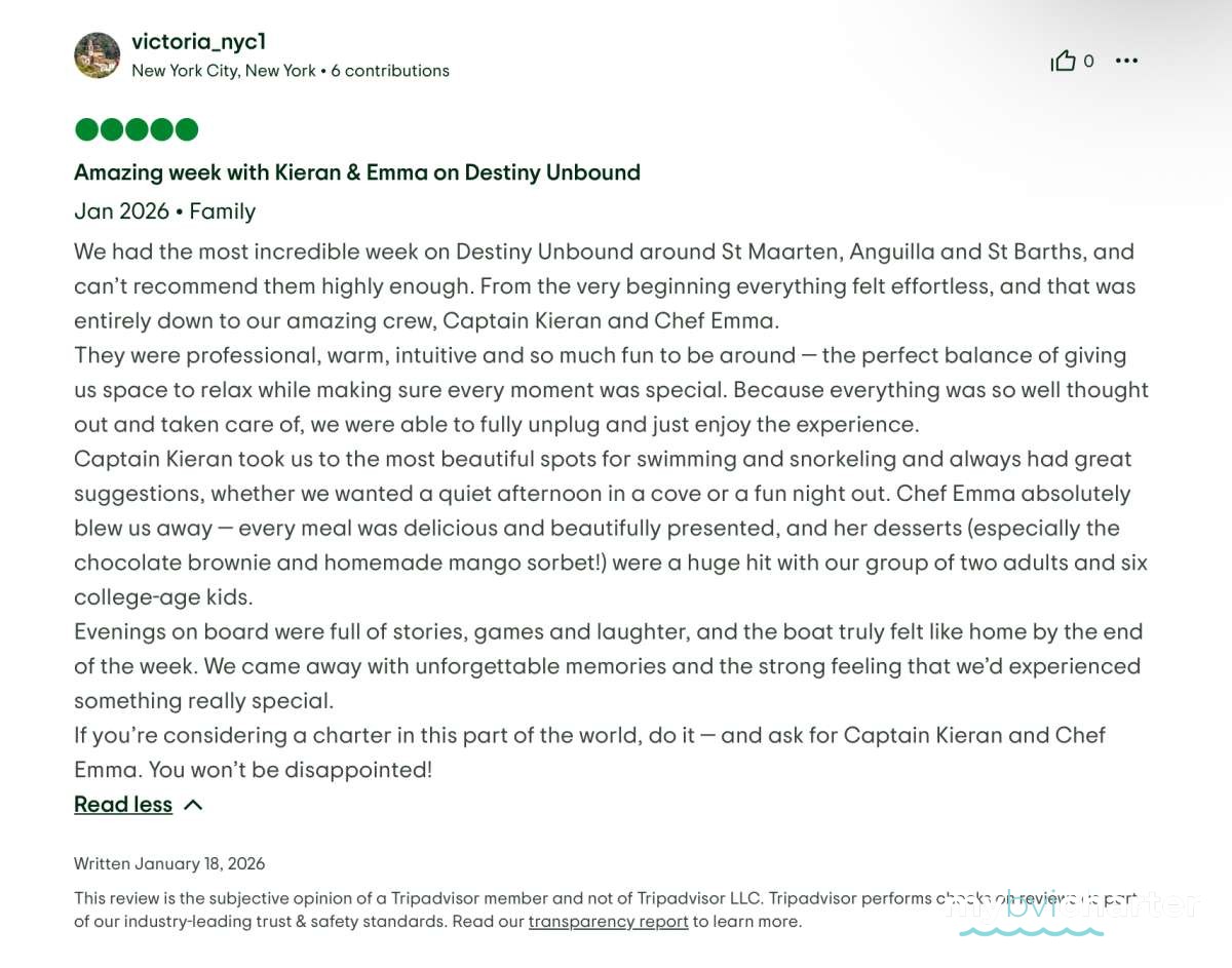 Beyond his impressive qualifications, Kieran is an energetic and personable captain who thrives on creating unforgettable guest experiences. Onboard Destiny Unbound, he loves crafting itineraries that showcase the very best of the BVI—hidden coves, pristine snorkeling spots, and vibrant island culture. Whether leading a shore excursion, organizing water sports, or sharing his passion for sailing, surfing, and fishing, Kieran brings warmth, enthusiasm, and a personal touch that turns every voyage into a truly memorable adventure.