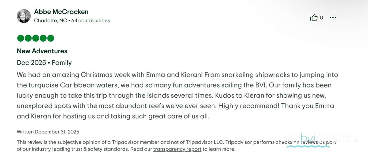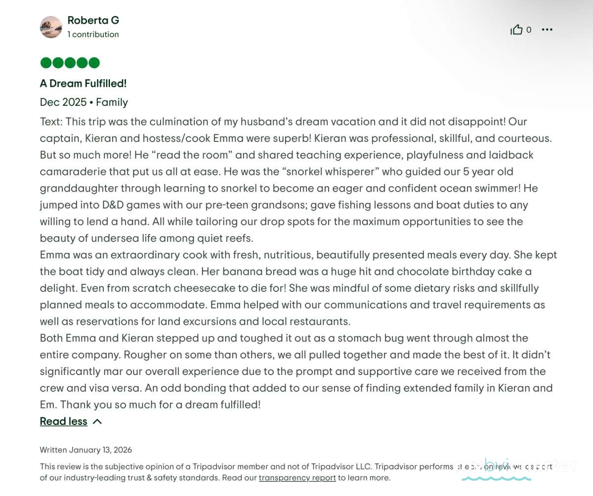 Captain Kieran took us to the most beautiful spots for swimming and snorkeling and always had great suggestions, whether we wanted a quiet afternoon in a cove or a fun night out. Chef Emma absolutely blew us away — every meal was delicious and beautifully presented, and her desserts (especially the chocolate brownie and homemade mango sorbet!) were a huge hit with our group of two adults and six college-age kids.