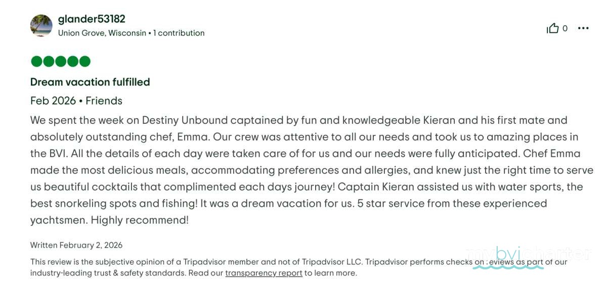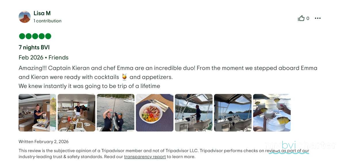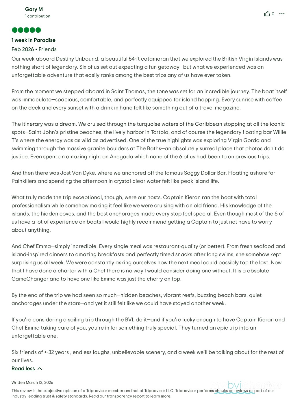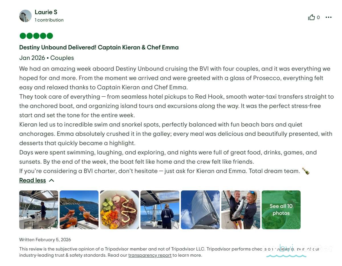 If you're considering a sailing trip through the BVI, do it-and if you're lucky enough to have Captain Kieran and Chef Emma taking care of you, you're in for something truly special. They turned an epic trip into an unforgettable one.