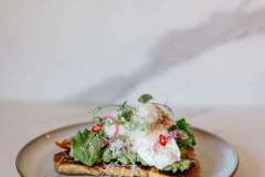 english breakfast stack on hash brown rosti with bloody mary sauce