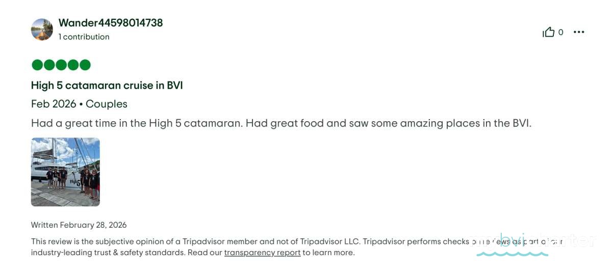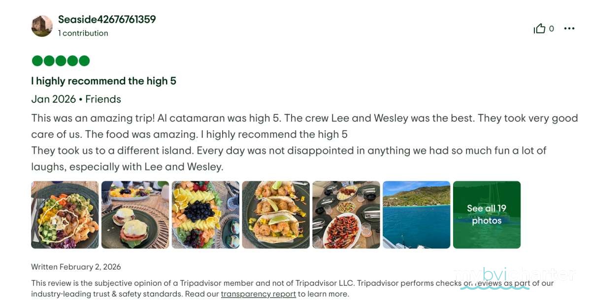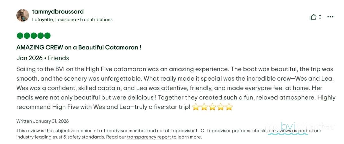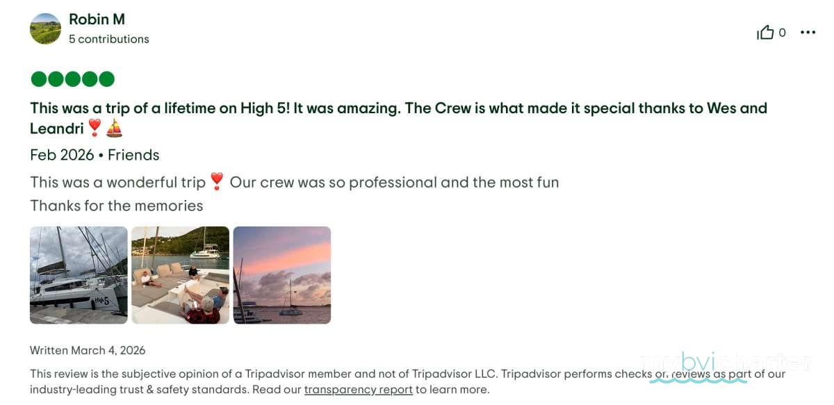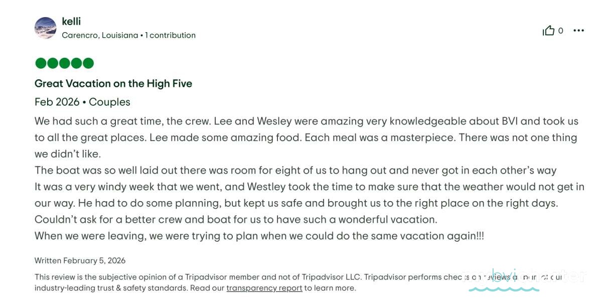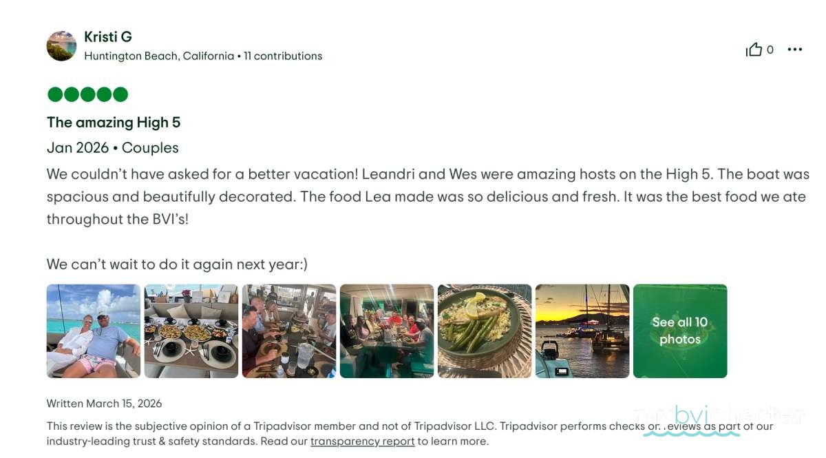 Thank you for such a wonderful trip on High 5. Everything has been first class - the food, the fun, and all the great company. Hot Tamale is the best captain/crew duo in the BVI! We will not forgot you guys.