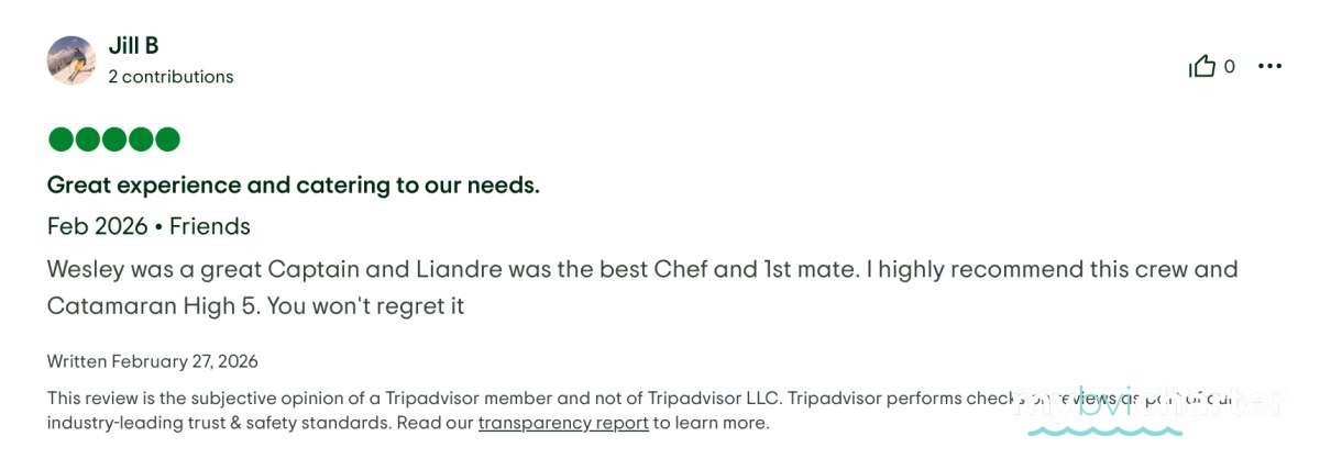 From the get go, I could tell right away that we were in safe hands with a knowledgeable captain who loves what he does. He was very patient and answered any questions that we had relating to the trip, the boat, the islands, etc. This type of vacation can make or break a trip, depending on the captain, I can say with confidence that we would feel safe and enjoy ourselves if we were to sail across the Pacific Ocean with this crew!