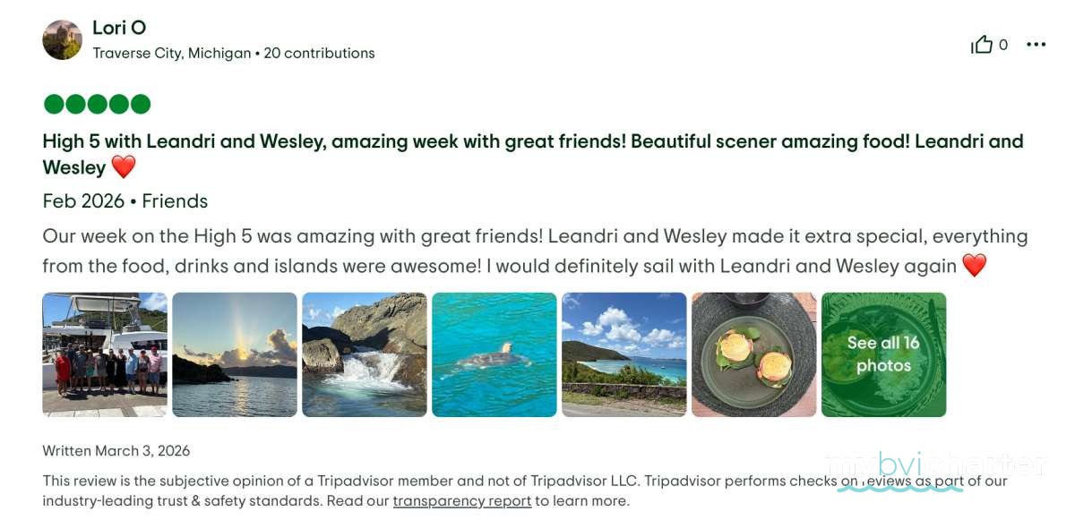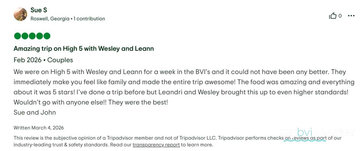 We look forward to booking another trip with the Yacht Vacation Company and without a doubt request that our new friends, Westley and Leandri, be the crew that makes another trip memorable!