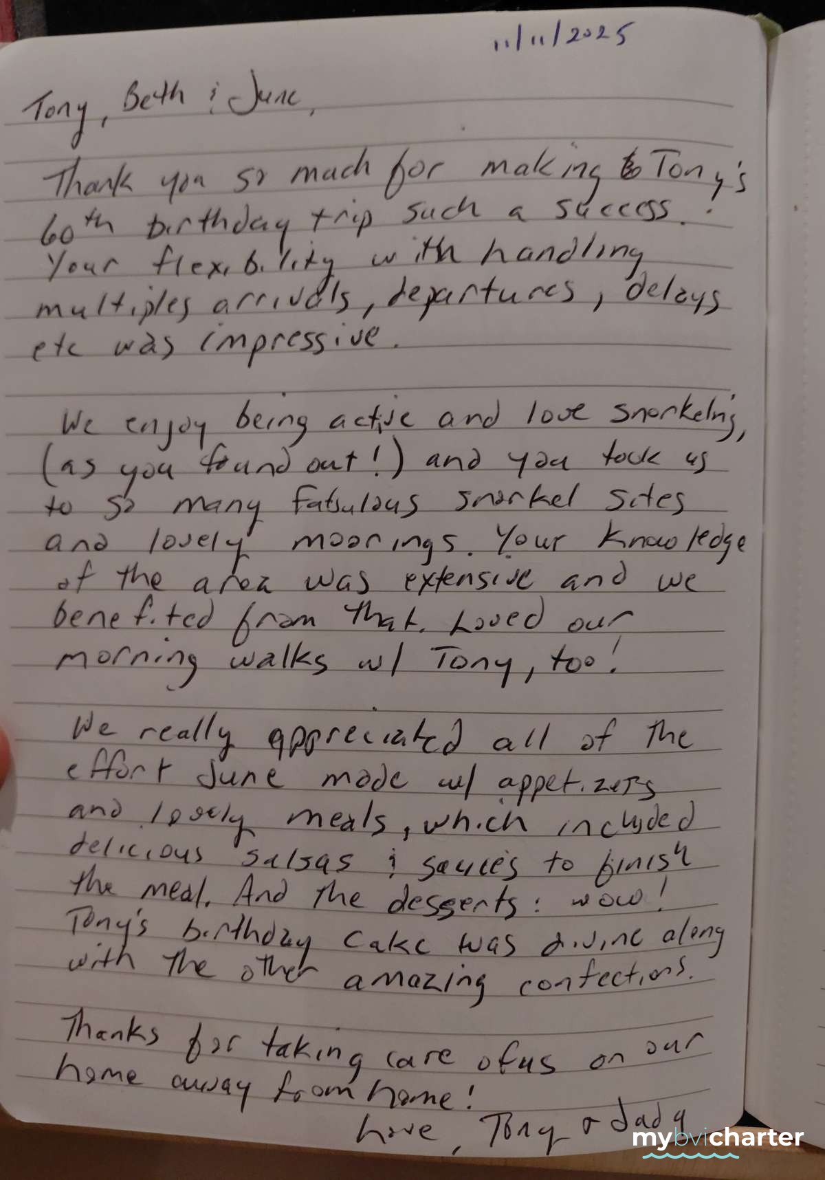 We deeply appreciate your work, patience and joy you brought to our trip.