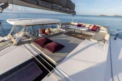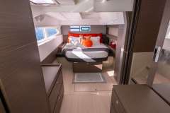 The airy salon is crafted for connection and relaxation, with panoramic windows and sliding glass doors that open wide to blend the interior with the shaded cockpit. A unique forward door leads directly to the foredeck, where sun loungers and trampolines invite you to soak in the sea breeze and sweeping views.