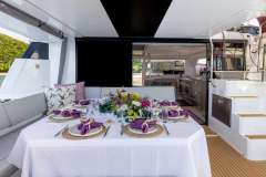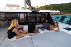 LIVIN is introduced primarily as a sailing catamaran. The yacht layout radiates from the main saloon, which connects to the aft deck. The aft deck is where heart of the yacht is and that's where the guests spend most of their time. The immersive cabins are located below the main saloon, connected by stairs (inquire about handicapped access). The cabins offer designer mattrace beds and feature ensuite bathrooms. Multiple portholes provide a connection with the natural world outside.