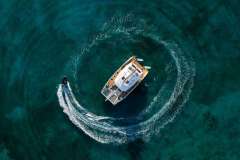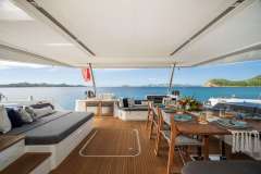 LYRA is presented primarily as a sailing catamaran. The the heart of the yacht is the main saloon, which connects to the aft deck. The aft deck features a variety of seating areas and that's where most of the delicious meals are served. The modern cabins are located in the 2 massive hulls. The cabins offer designer mattrace beds and feature ensuite bathrooms. Multiple portholes offer desirable views, while providing privacy if needed.