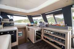 She has a bright and homely interior, with a lovely seating area in the salon, perfect for games or a movie night with AC. A galley that has been fitted with all the bells and whistles so your chef can produce only the finest meals. She has an ice machine, juicer, state of the art coffee machine and a water maker for ample still and sparkling water. She has a fusion sound system, Starlink Wi-Fi and wireless charging pads all through the yacht, to ensure your music is never interrupted.
