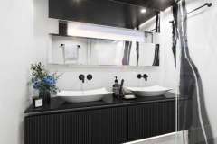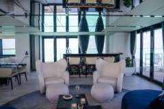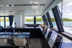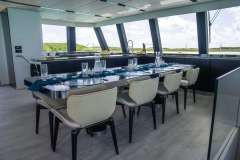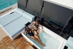 MARIA THERESE is introduced primarily as a sailing catamaran. The central space of the yacht is the main saloon, which connects to the aft deck. The aft deck is expansive, with a comfortable dining and seating area and that's where the guests spend most of their time. The immersive cabins offer unbeatable views in the morning and are located just below deck. The cabins are located in the 2 massive hulls. Multiple portholes connect you with the outside world.