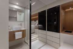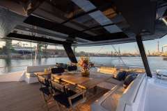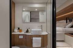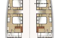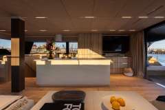 Moon 60 Hull 8 2025 is introduced primarily as a sailing catamaran. The the core layout is spread out from the main saloon, which connects to the aft deck. The aft deck is expansive, with a comfortable dining and seating area and that's where the guests spend most of their time. The modern cabins are located below the main saloon, connected by stairs (inquire about handicapped access). The cabins are located below the main saloon, connected by stairs (inquire about handicapped access). Multiple portholes supply a sunny feeling, with the option for darkness and privacy.