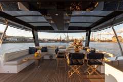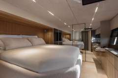 The generously sized saloon, featuring a sofa and dining table, creates a welcoming and elegant atmosphere. With direct access to both the front and aft decks, passengers can seamlessly enjoy the breathtaking views of the surrounding ocean. The large flybridge further enhances the vessel's appeal, providing additional seating, a bar, and a dining area, allowing guests to relax and unwind in style.