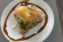 Grilled halloumi with avocado, sweet corn, and balsamic glaze.