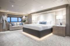 6 Staterooms:1- Master Stateroom - On Deck, Full Beam Stateroom, King Bed on Centerline, Office Area, Walk-In Closets - Drawers, Bathtub, His & Her Sinks, His & Her Toilets, Shower