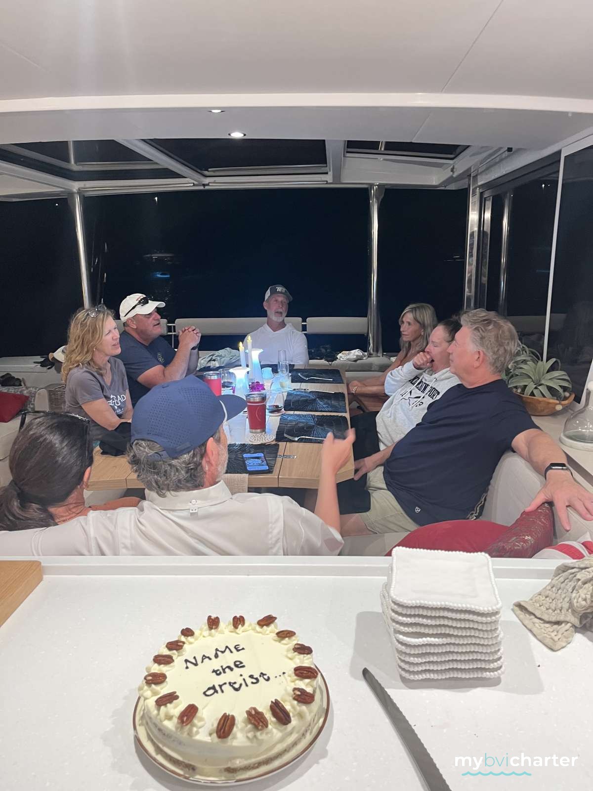 Wow! It’s hard to find words that will truly capture & describe the experience we had with you both on No Inheritance this past week. The boat is beautiful and amazing and that is what dazzled us when we stepped on it the first day. But as the week unfolded, it became very apparent that you both are the real gem on the boat.Owen – you’re on it – everything from our safety, to knowledge of the islands & waters, serving drinks, sailing expertise, and your calm, friendly demeanor is so welcoming.Mia – the sounds of mixing & cutting in the kitchen are the most pleasant alarm and your magic starts as delicious smells call us out of our rooms. I can honestly say your meals have been extraordinary. Your eyes & smile radiate love & life!You two are what made our vacation so memorable and it was a gift to watch how you work together, each bringing your knowledge & talents together to create this perfect vacation for us!