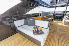 NO SURRENDER is a 110'’ Riva Dolcevita model that offers an extremely quiet, fast and comfortable cruise with a distinctly modern but opulent style. Riva's choice in finishings is well executed; striped tropical rosewood, Patrona Frau leather, crystal, and chrome accents add a luxurious level of detail to the interior where it's normally overlooked. On the exterior, a metallic shark gray and black carbon fiber complement her sleek, svelte design.The expansive sundeck provides a great area for entertainment, offering lounge spaces and a wet bar. Alfresco dining is found on both the main deck aft and the covered flybridge. Another great feature on this vessel is the hideaway jacuzzi located on the bow which can be closed away from sight and used as a seating area, or opened up for use to truly enjoy la dolce vita!