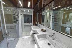 The Full-beam Master Suite is located on the main deck with King size bed (facing forward). Two walk-in cedar-lined closets. Sizeable 49" Apple TV and mini-iPad for A/V control. Vanity and ample storage. Master bathroom countertops and floors are finished in Carrara marble; large glass doors separate a large walk-in shower, and premium features include a mirrored glass wall and towel heater.
