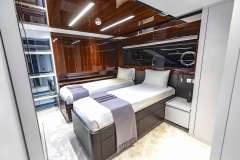 4 Guest Staterooms: all located downstairs connected to a spacious central lobby area. Cabins consist of 3 VIPs with Queen beds and 1 Twin room with 2 twin beds and 1 Pullman. Each with its own ensuite head and separate shower. All staterooms have satellite televisions with Apple TV in all staterooms, 49" screens in the double staterooms, and 43" screen in twin cabin. Integrated Bluetooth audio and iPad minis for wireless control. Cedar-lined closets in each.