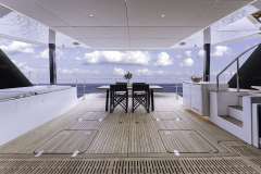 Outdoor living wins. The aft deck is geared for shaded dining and easy downtime, and the wide swim platform makes getting in and out of the water a non-event. Quick dip. Repeat.