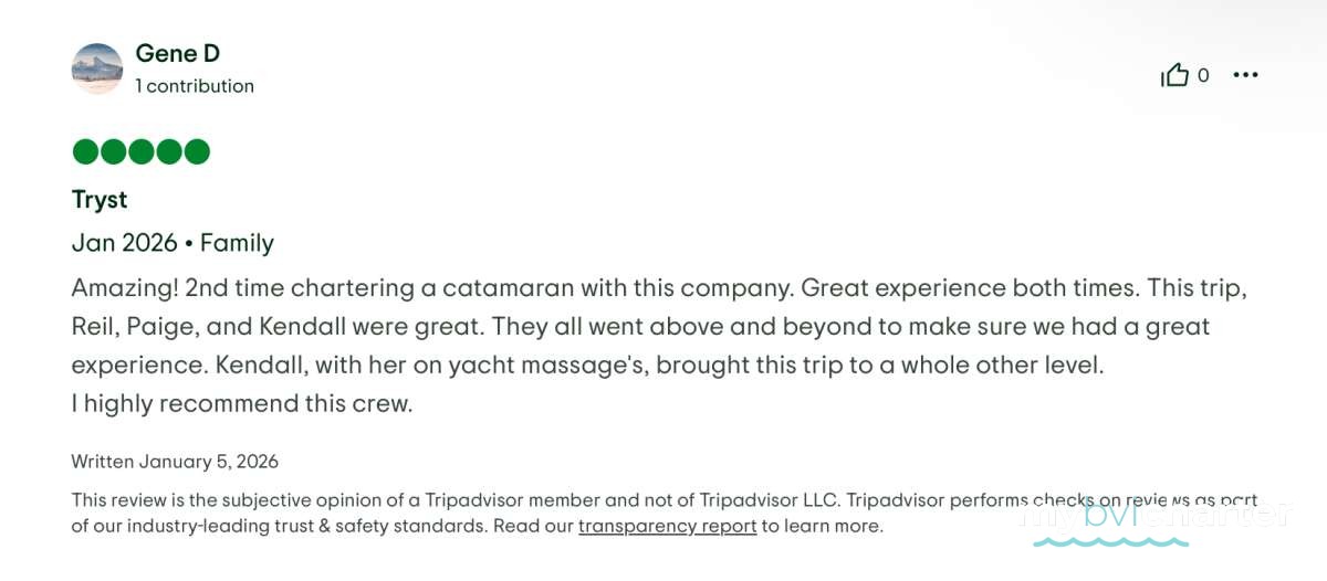 CJ the captain alwyas made us feel completely safe and relaxed while navigating and meeting every need. Mate McKensie was always one step ahead, anticipating our needs and ensuring every detail was handled flawlessly. And Chef Tilly.. was superb!!! Every meal was beautifully prepared, delicious, and felt like a personalized culinary experience on the water. Tilly even went out of her way to accommodate my non eating seafood requests. I know.. a week at sea and no seafood!! lol but Tilly always had something spectacular for me to enjoy along with everyone else.