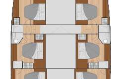 Six equal cabins. Accommodation is arranged as six double cabins, each with a queen bed and en-suite facilities. No one draws the short straw. Just pick a side.