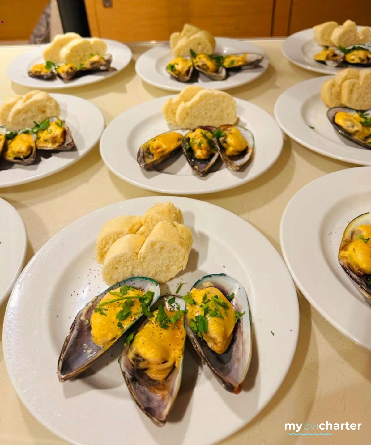 reflect the mood of the voyage—vibrant seafood lunches after a dive, refined wine-paired
