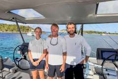 Accommodation is straightforward and generous: up to 8 guests in 4 cabins, including a full master suite, all with ensuites, backed by a crew of 3 who do this for a living, not as a hobby. The catamaran platform plus a shallow 1.7 m draft means stable cruising and access to the shallower bays other boats skip.