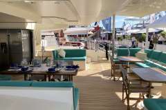 The interior features spacious and bright areas, including a luxurious master cabin, several double guest cabins, and social spaces designed for comfort. The deck provides multiple relaxation areas, including a sunbathing zone, outdoor dining area, and easy access to the water.