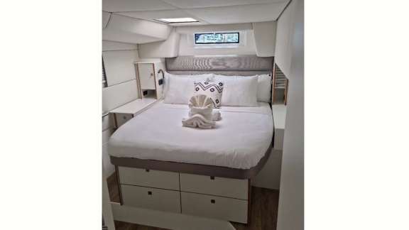 SEVEN is offered primarily as a sailing catamaran. The yacht layout radiates from the main saloon, which connects to the aft deck. The aft deck is where heart of the yacht is and that's where most of the meals are served. The immersive cabins are connected by stairs to the main saloon - roomy, comfortable and pleasant. The cabins are located in the 2 massive hulls. Multiple portholes connect you with the outside world.