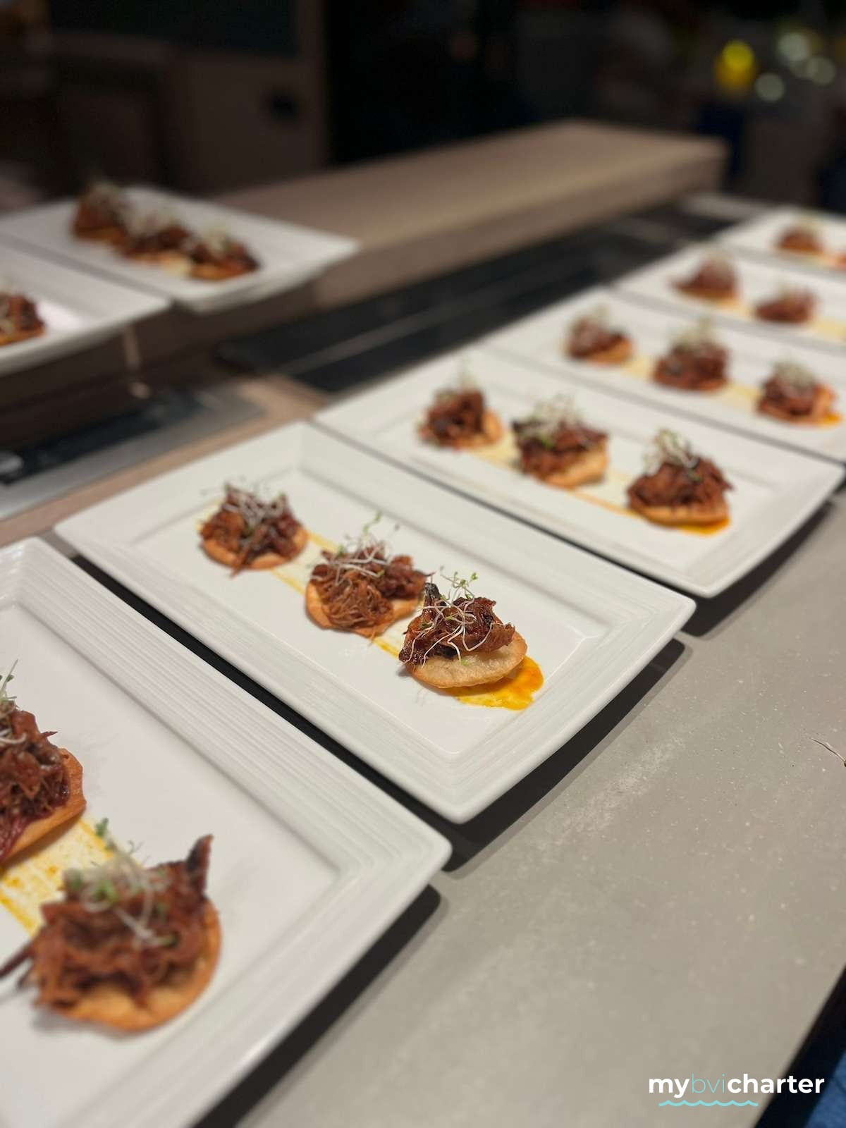 We decided to include one other couple since the Sip Sip is 62 feet long. We divided the 3 cabins - one couple gets the large cabin and the other couple gets both of the other 2 cabins. The Sip Sip is extra wide making it very stable and the galley is below the main deck and so when the chef is cooking, they are out of sight. I was also checking to see what the food preparation looked like on the boats. The Sip Sip had the most beautiful looking food, platings, and menu of all the boats that I looked at.