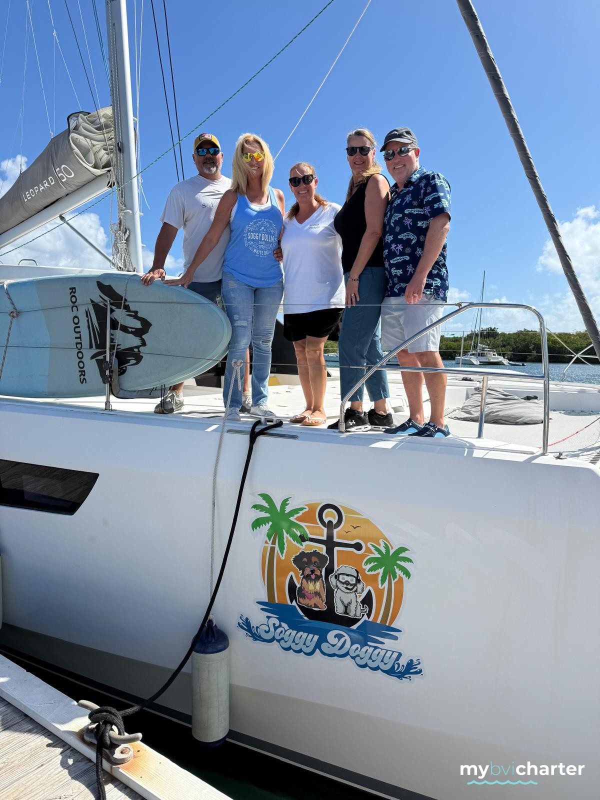 SOGGY DOGGY is a 2019 Leopard 50 built for open-air living with the next-evolution layout that made the Leopard line a fleet favorite. A true highlight is the extra-spacious flybridge with lounge seating, table, and sunbed—plus generous headroom even under sail, so guests can move around without the boom in the way. Floating stairs connect the aft cockpit to the flybridge, and Leopard’s signature helm placement keeps the action social, not separated. Sleeps up to 6 in 3 cabins: 1 Master Owner’s suite plus 2 Queen cabins. Water toys are onboard for endless fun on the water.Breezy, social, and beautifully designed—SOGGY DOGGY is island time done right.