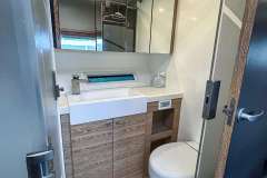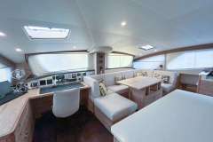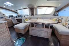 Her layout is the sought-after owner’s version, offering a spacious full-length suite on the starboard side, plus two luxurious guest cabins on the port side—each with its own ensuite featuring a separate shower, head, and vanity. The interior is bright and inviting, with a large island galley and an open-plan lounge/dining area perfect for sharing meals, playing games, or simply relaxing.