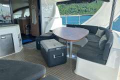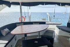 Outside, Stella Blue offers multiple areas to unwind. The generous cockpit includes a large dining table and plush lounge seating, while a smaller daybed nook beckons for cozy afternoon naps. Aft, guests can enjoy a full-width chaise lounge—an ideal spot for stargazing or soaking up sea views. Forward, twin trampolines and ample deck space invite sunbathing and quiet moments under sail.