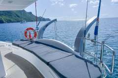 Wide side decks ensure safe passage fore and aft, and an integrated overhead shower at the transom makes rinsing off after a swim easy. For a truly unique experience, Captain David recommends the “Lanai”—a breezy shaded spot between the hulls, perfect for floating in comfort and style.