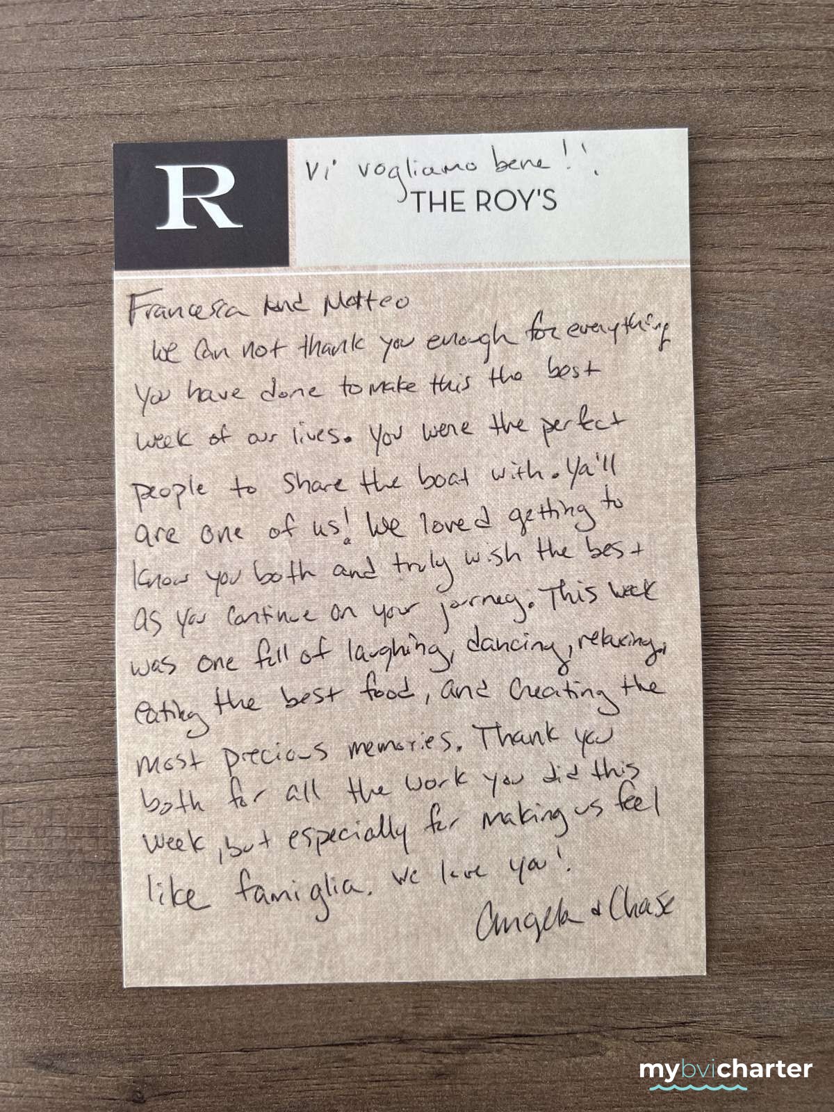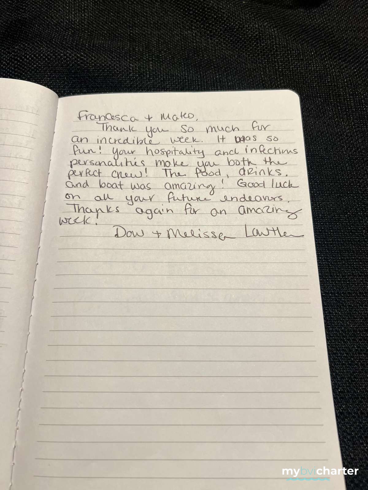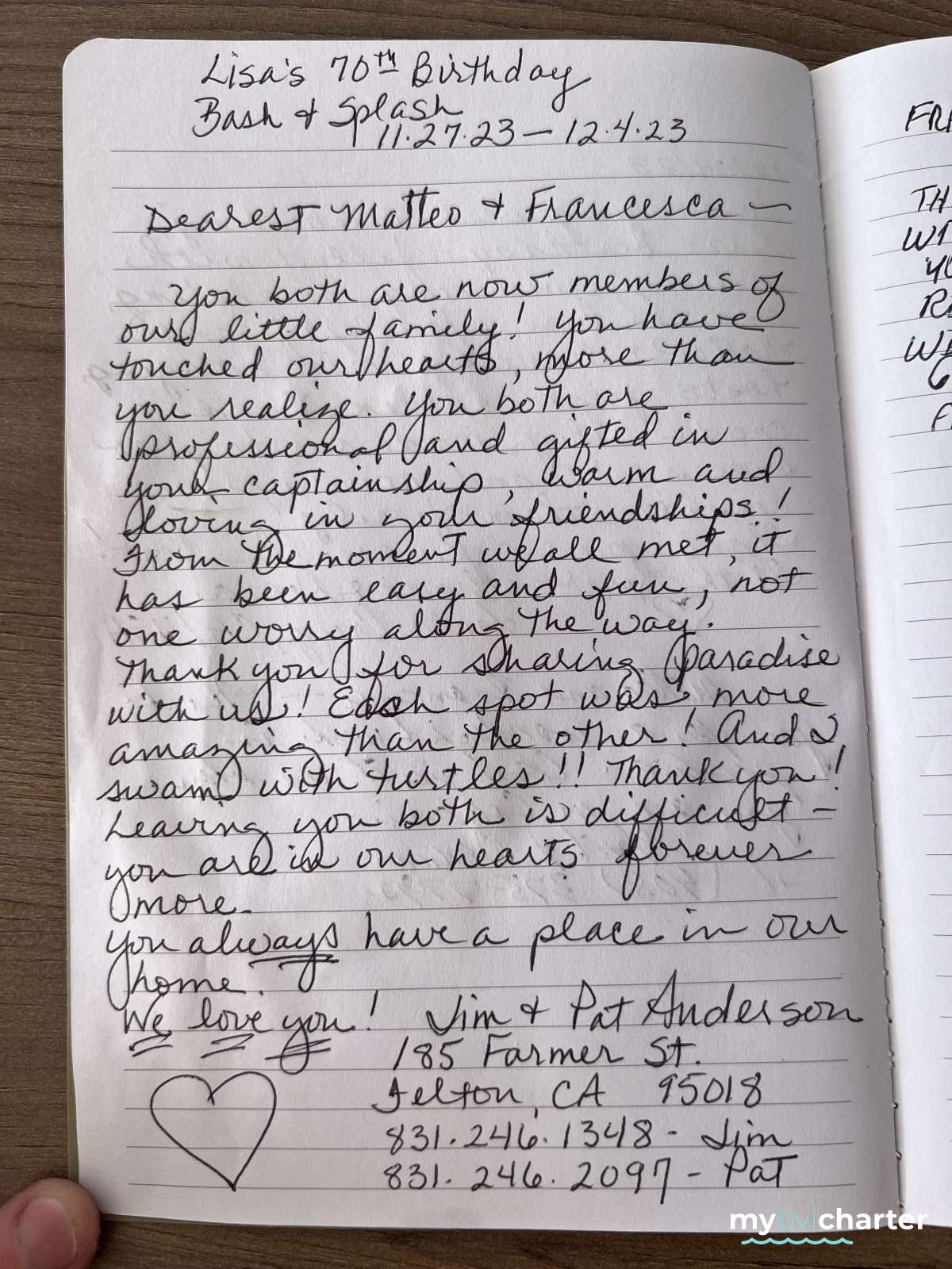 we cannot thank you enough for everything you have done to make this the best week of our lives. You were the perfect people to share the boat with. Ya'll are one of us!