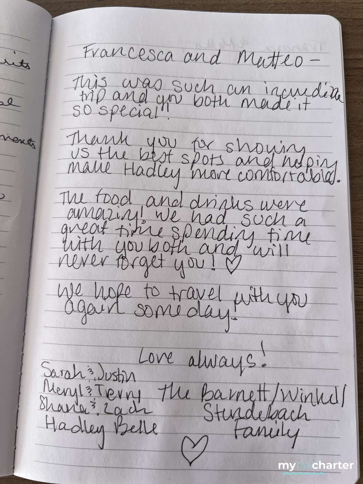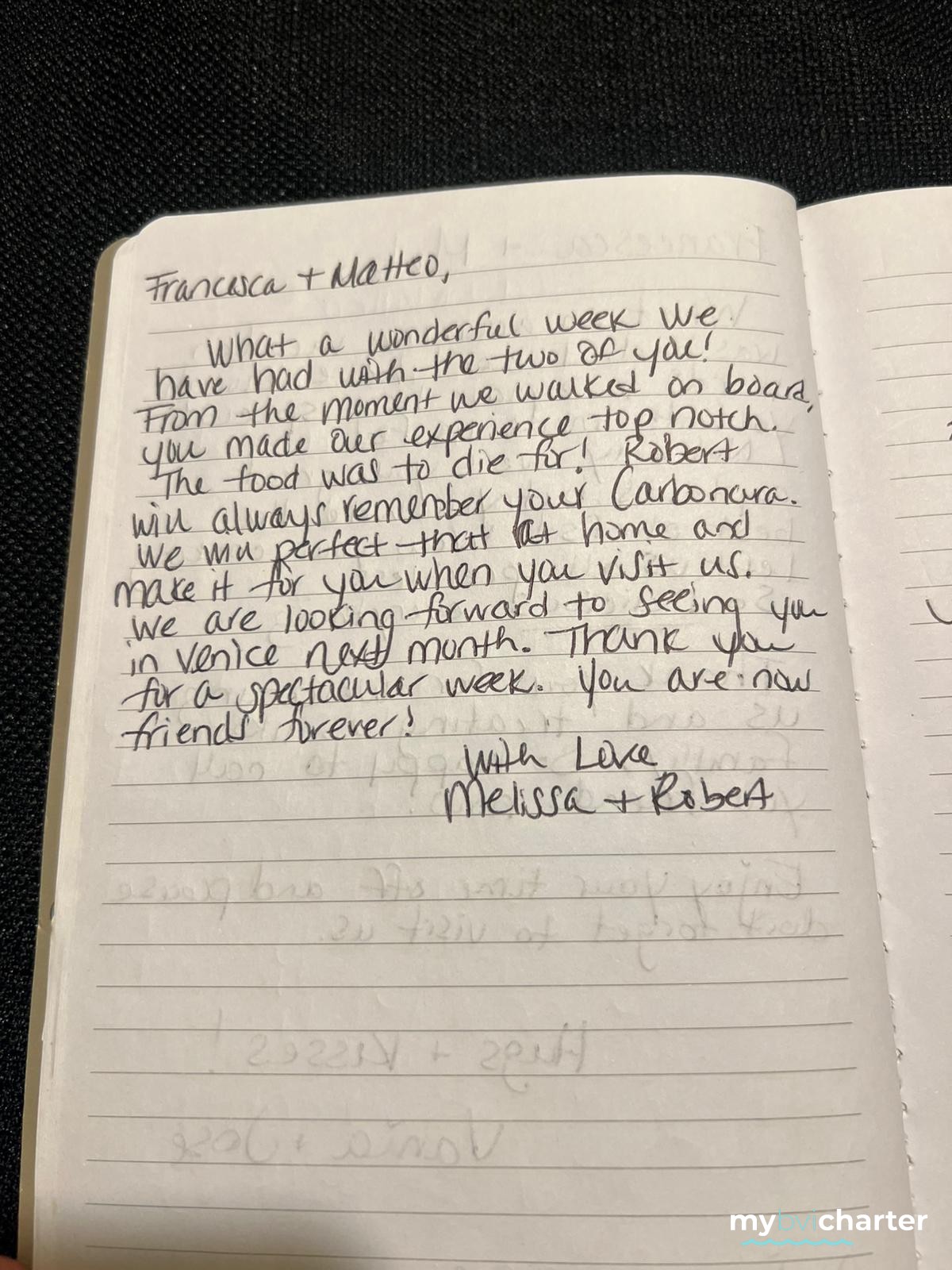 What a wonderful week we had with the two of you! From the moment we walked onboard, you made our experience top notch. The food was to die for! Robert will always remember your Carbonara. We will perfect that at home and make it for you when you visit us. We are looking forward to seeing you in Venice next month. Thank you for a spectacular week. You are now friends forever!