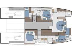 Treasured C’s is classified primarily as a power catamaran. The yacht layout radiates from the main saloon, which connects to the aft deck. The aft deck features a variety of seating areas and usually it is where you, as a charter guest, spend most of your time. The tastefully decorated cabins are connected by stairs to the main saloon - roomy, comfortable and pleasant. The cabins offer unbeatable views in the morning and are located just below deck. Multiple portholes add to the feeling of connection with the discovered environment.