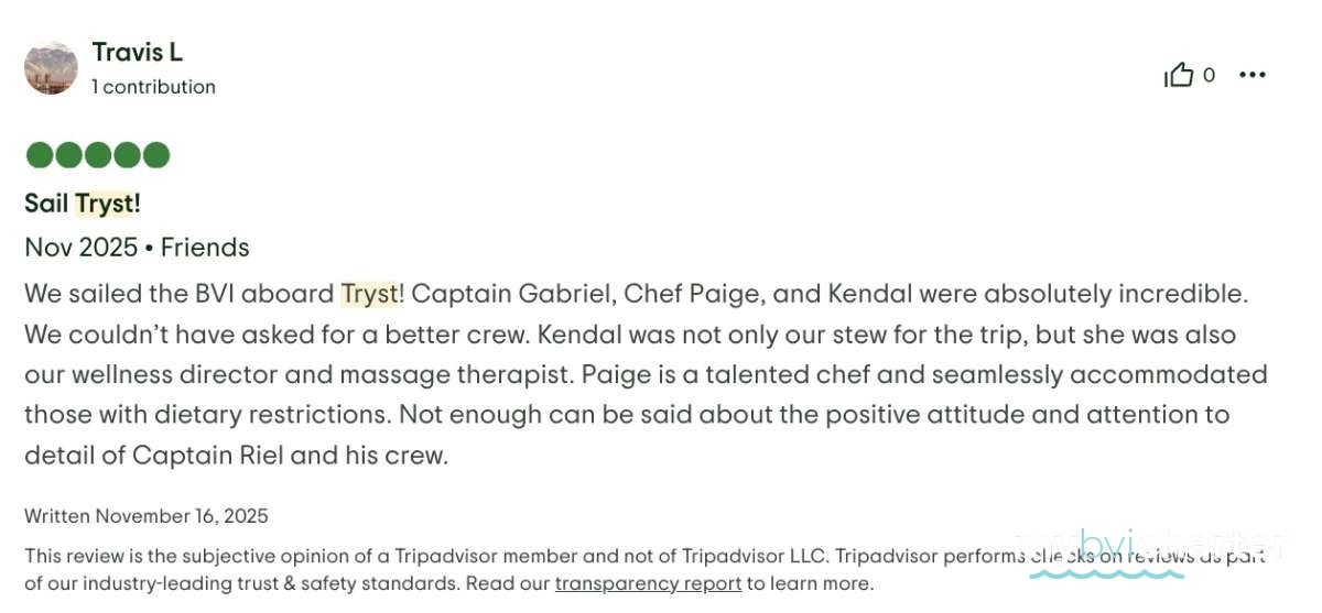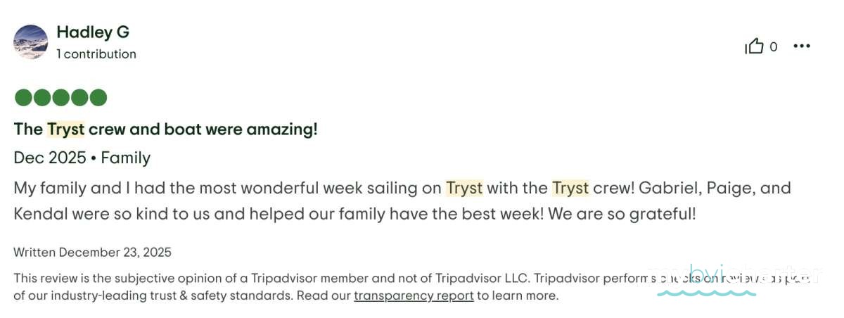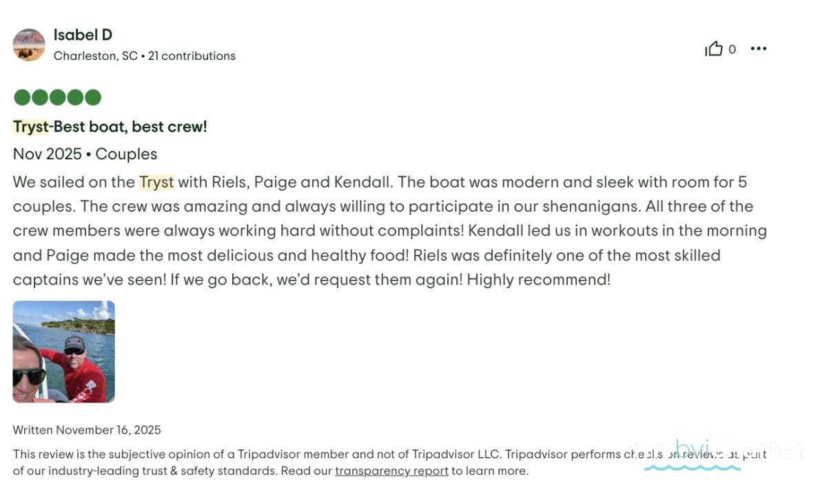 The best part- the crew! First of all, having three crew was a game changer! The captain, Riel, could 100% focus on the boat, water toys and itinerary. The chef, Paige could 100% focus on preparing meals and assisting the captain. And then our masseuse, Kendal, was our “hostess with the mostess”. Having that extra person to be not just the masseuse and cleaner, but also the bartender, picture taker and bubbly event hostess was fabulous. The 3 of them worked so seamlessly together, you could tell that they enjoyed it, were very professional, had quite a bit of experience and know every detail that is needed to proactively make a trip perfect. The food was beyond amazing and perfectly tailored to our tastes. The massages and morning workouts were a fantastic addition. Drinks were perfection. The itinerary was flawless. And the edited video of the trip they did for us was a fantastic surprise, loved it! We will always remember all the amazing chats and hangouts we had with the crew and the extremely elevated experience of the trip they provided.