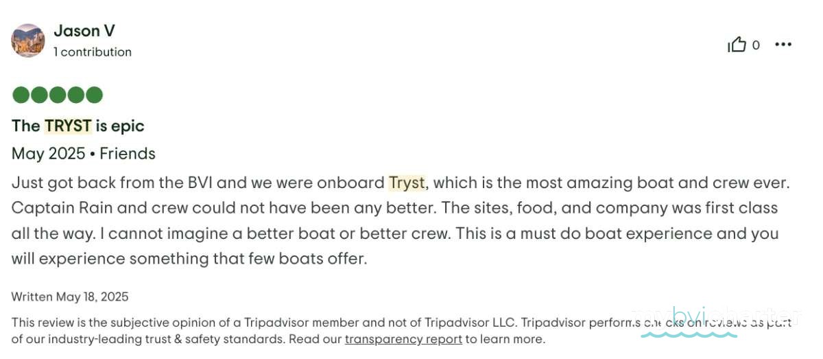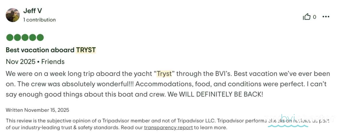 8. The wellness stew offers onboard massage during charter. 1 massage per guest is included with no more than 2 massages per day in total due to other duties and guest activity.Pickups outside of the BVI have a relocation fee.